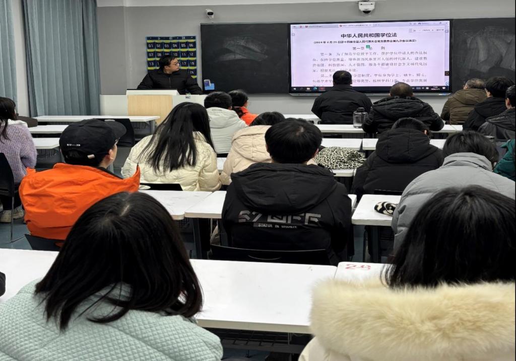 会上,刘院长强调了《学位法》在高校教育教学工作中的关键地位与深远意义。他指出,随着教育法治进程的不断推进,《学位法》的实施将为学位管理和人才培养提供坚实的法律保障,全院上下务必高度重视,切实将其学习宣传贯彻工作落到实处,确保每一位师生都能深刻领会法律精神并严格遵循。在接下来的一段时间内,学院将把《学位法》纳入各类重要会议的常规学习内容,通过集中研讨、案例分析等丰富形式,促进师生深入理解法律条款,确保学习宣传全覆盖,营造浓厚的学习氛围。同时,学院将全面梳理现有相关管理制度,在教育教学过程中,尤其是毕业设计(论文)指导与审核环节,将严格按照新的法律要求和标准执行,进一步强化质量把控,确保学位授予工作的公正、公平、公开,切实保障学生合法权益。