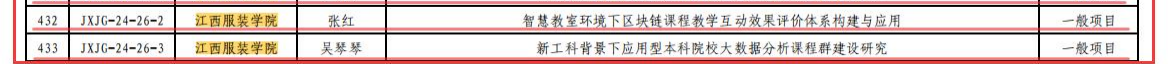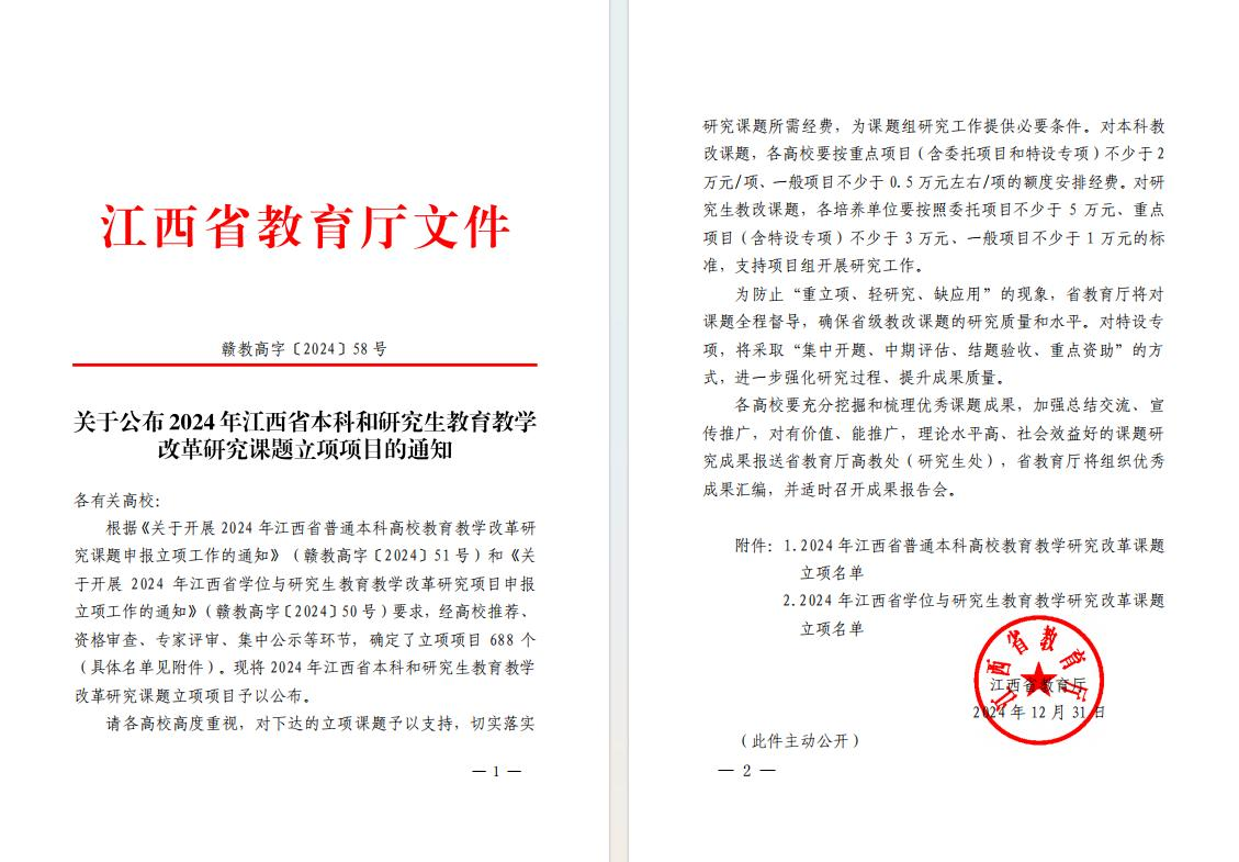 【AC米兰中文官方网站讯】近日,江西省教育厅公布了2024年江西省普通本科高校教育教学研究改革课题立项名单,其中米兰官网吴琴琴、张红老师申报的教育教学改革研究课题项目获得立项。
