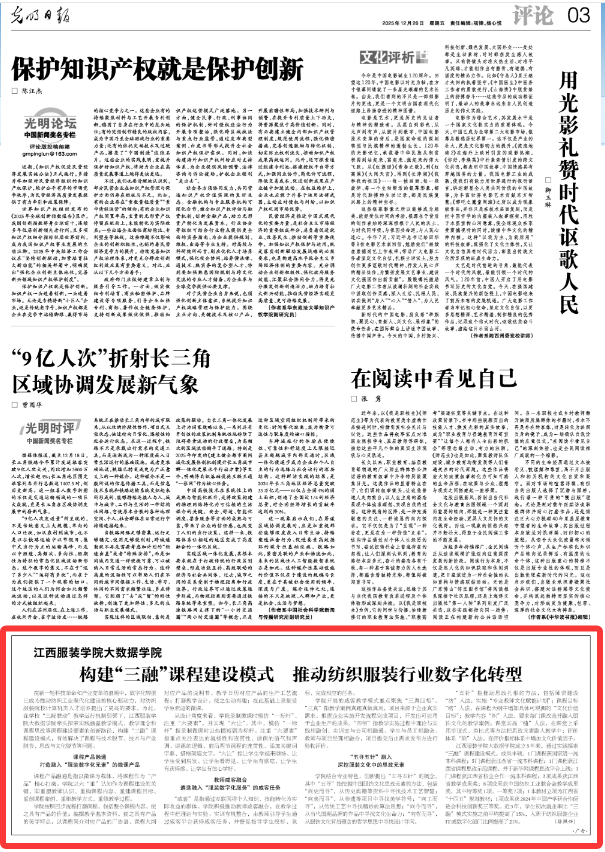 《光明日报》刊登米兰官网教育教学改革成果《构建“三融”课程建设模式 推动纺织服装行业数字化转型》