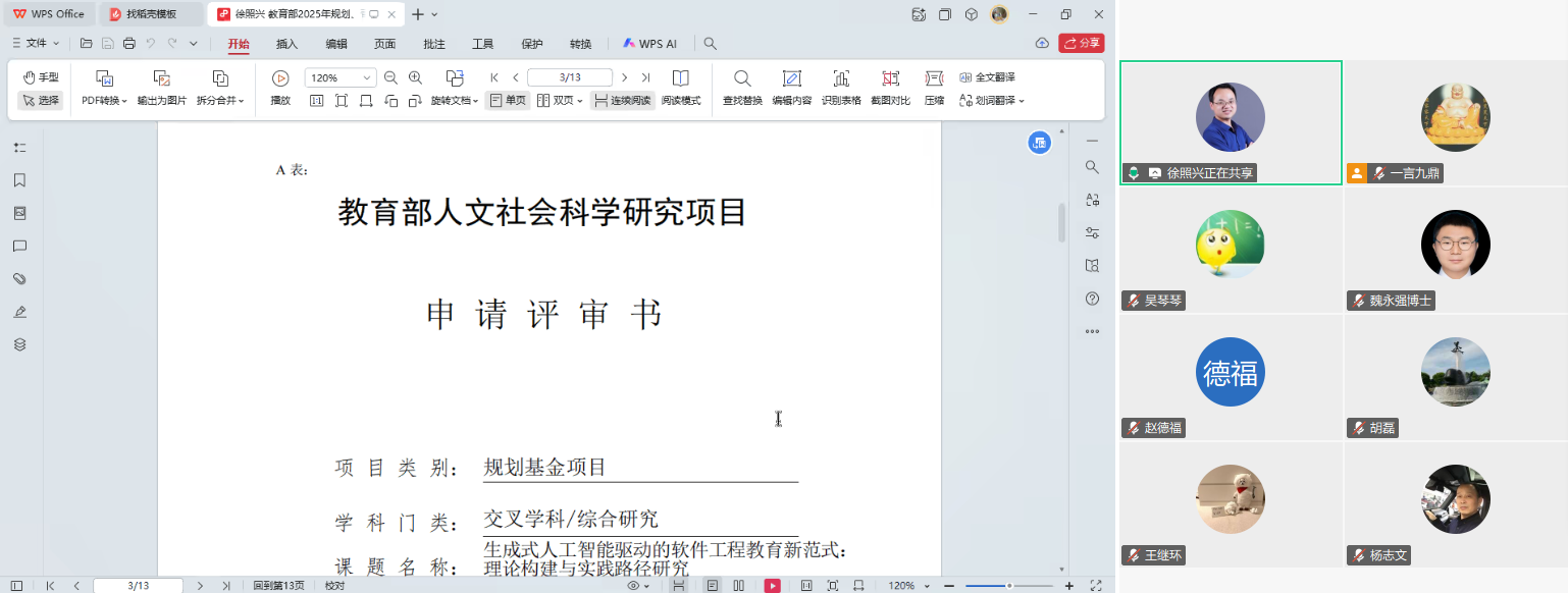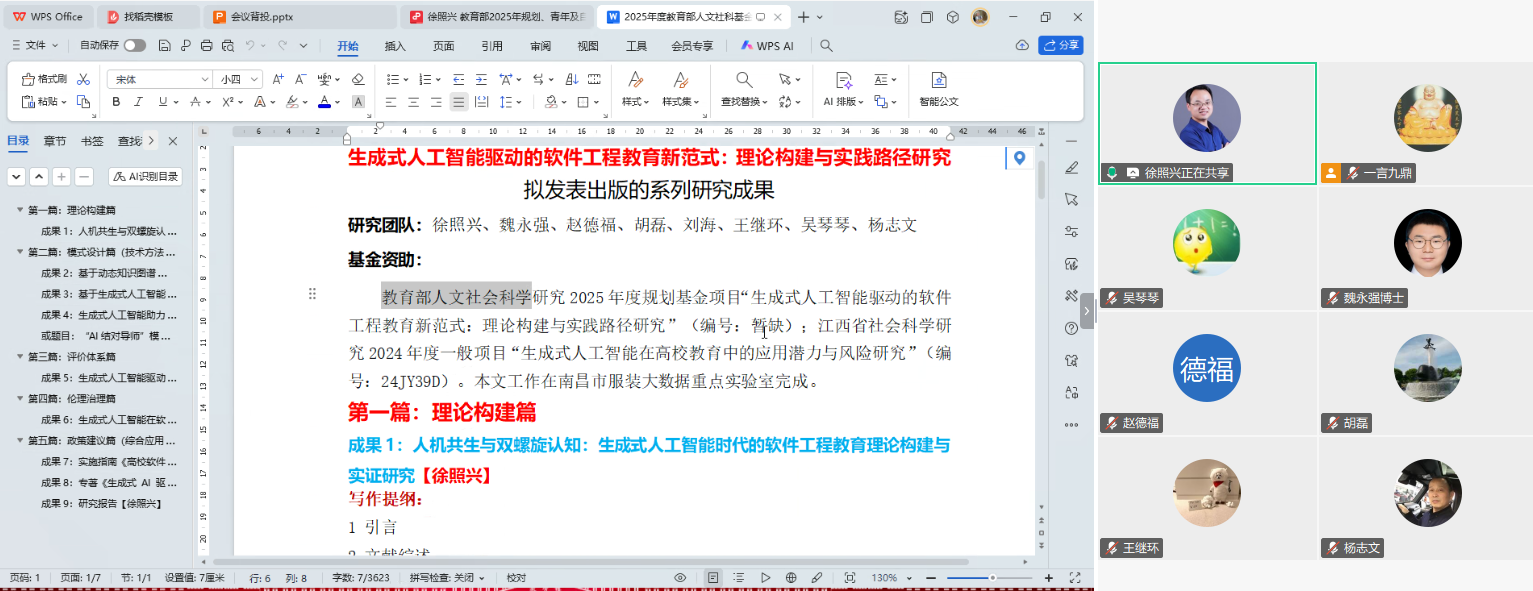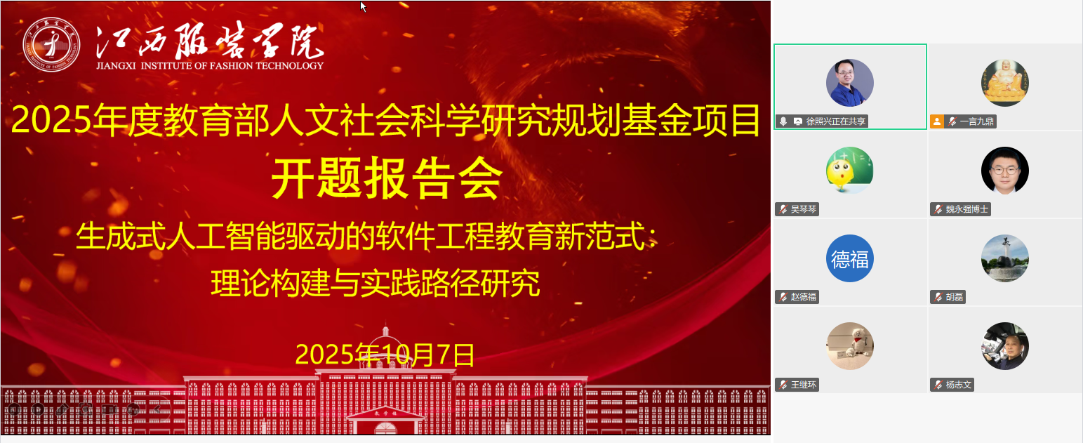 【AC米兰中文官方网站讯】2025年10月7日晚,AC米兰中文官方网站以线上形式召开2025年度教育部人文社科规划项目—“生成式人工智能驱动的软件工程教育新范式:理论构建与实践路径研究”开题报告会。会议由项目主持人AC米兰中文官方网站院长徐照兴教授主持,核心目标是使全体课题组成员再次明晰课题研究方向、研究内容、分析研究任务及初步研究分工,为后续研究有序推进奠定基础。