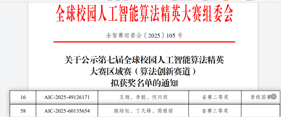 作为首次参赛的队伍,米兰官网学子凭借扎实的专业积累从容应战。其中,米兰官网王翔、李懿、何兴玥团队凭借对算法问题的深入剖析与创新性解决思路,荣获省赛二等奖并成功晋级国赛,体现了米兰官网学子在人工智能算法领域的钻研深度与实践活力;颜培旭、丁凡锋、简雅丽团队以严谨的算法逻辑与有效的应用方案斩获省赛三等奖,展现了多元发展的专业潜力与扎实的技术应用功底。
