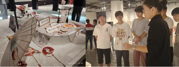 在学院布置展出的《墨兰》工艺品展台前,本院讲解员倪烨炜为同学们进行作品讲解,该作品深入挖掘红色历史文化,以女性革命同志为切入主题。团队成员将自己家乡传统油纸伞制作工艺与其红色文化思想相结合,将富有女性柔情与爱美之心的代表事物油纸伞与当时革命艰苦环境之下的女性同志们形成鲜明的对比。不是我们的女性革命先烈们没有普通女子的情感与思想,而是在那个充满红色革命历史年代。她们为了祖国、为了民族和同为女性民主革命家的秋瑾所著《满江红》中的豪言一般“身不得,男儿列;心却比,男儿烈“。引导同学们品味红色经典、传承红色基因、弘扬革命精神,自觉争当红色基因的学习者、传承者、实践者。