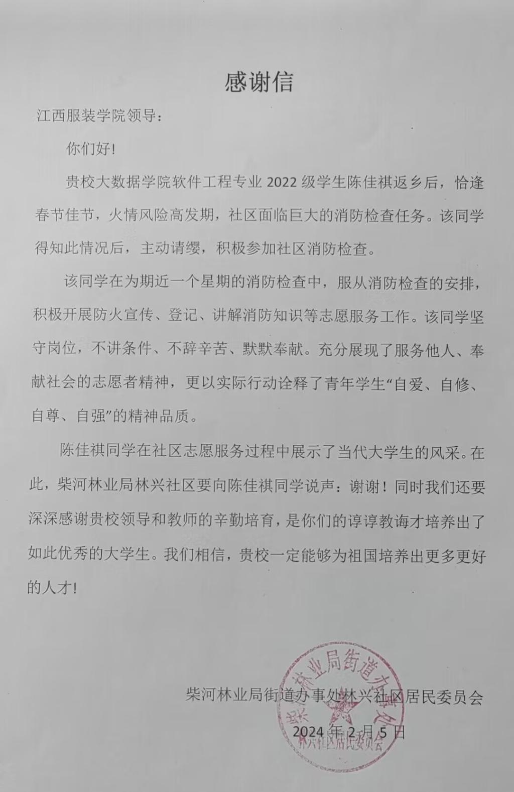 至今柴河社区,在过年期间依旧保持着零事故发生的记录。此项数据表明,社区消防排查活动效果显著。志愿者也在这次活动中,深切地领悟到了消防安全的重要性和必要性。通过此次实践,陈佳祺同学表示不仅掌握了消防安全检查的基本知识和技能,了解了各种消防设施的使用方法和注意事项,还认识到了预防火灾的极端重要性,以及在火灾发生时正确应对的必要性。