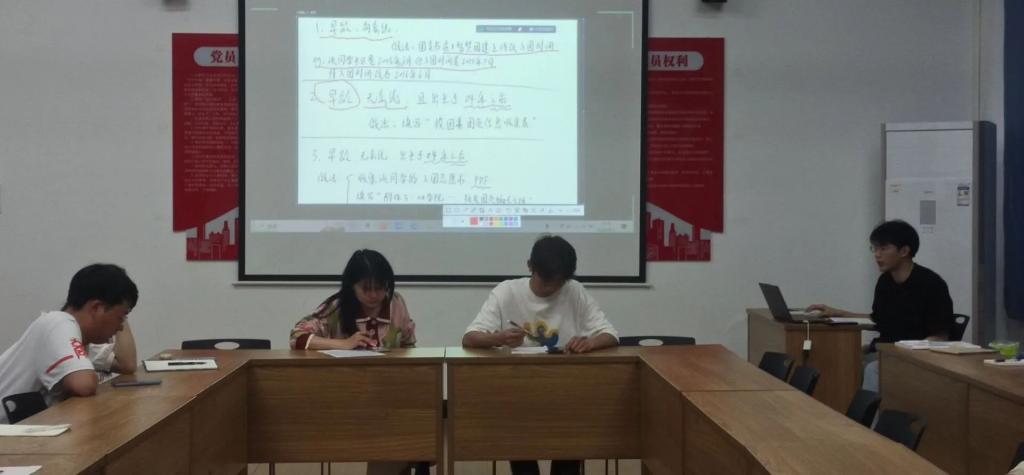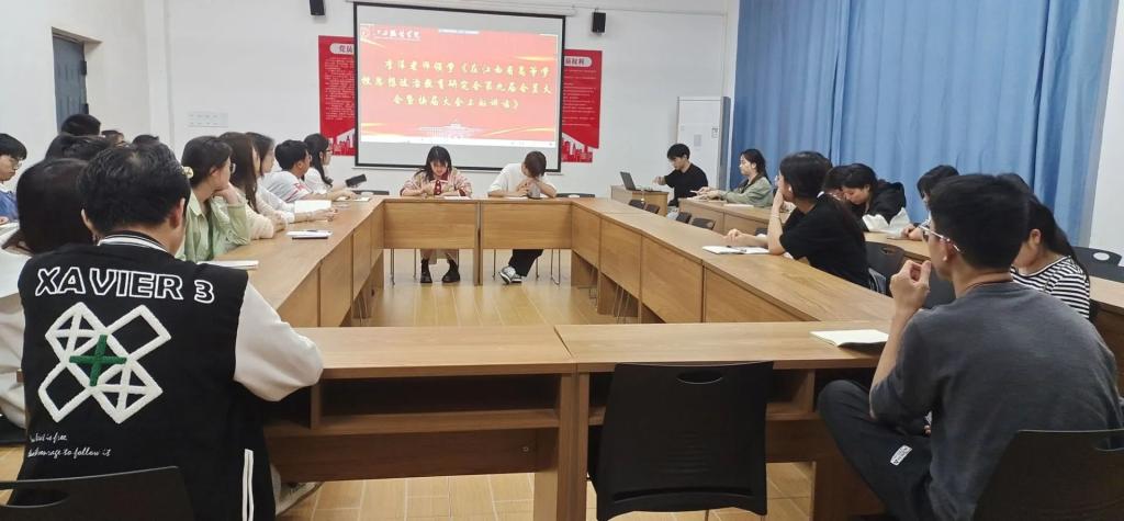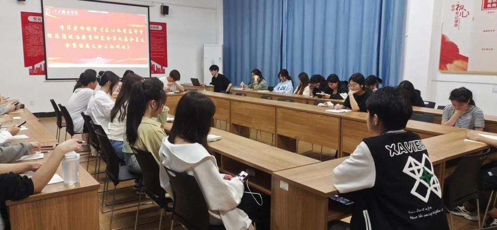 会议伊始,由分团委副书记李萍老师领学《在江西省高等学校思想政治教育研究会第九届会员大会暨换届大会上的讲话》,深入学习领会汪立夏重要讲话精神,学深悟透其关于高校思政工作的重要论述。