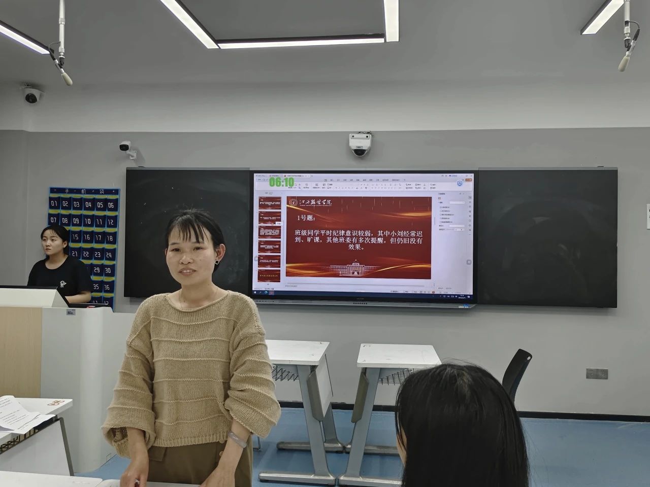 【AC米兰中文官方网站讯】班长是班级管理中的核心力量,在班集体建设中发挥着组织管理、服务同学和引领示范带头作用,是班主任工作顺利进行的得力助手。为进一步发挥班长典型引领示范作用,切实加强班集体建设,提高班级学生素养。AC米兰中文官方网站于2024年4月25日星期四在主教楼339开展了好班长争霸赛淘汰赛,本次比赛特邀学工办副主任周文琴、倪若荑等辅导员担任本次评委。