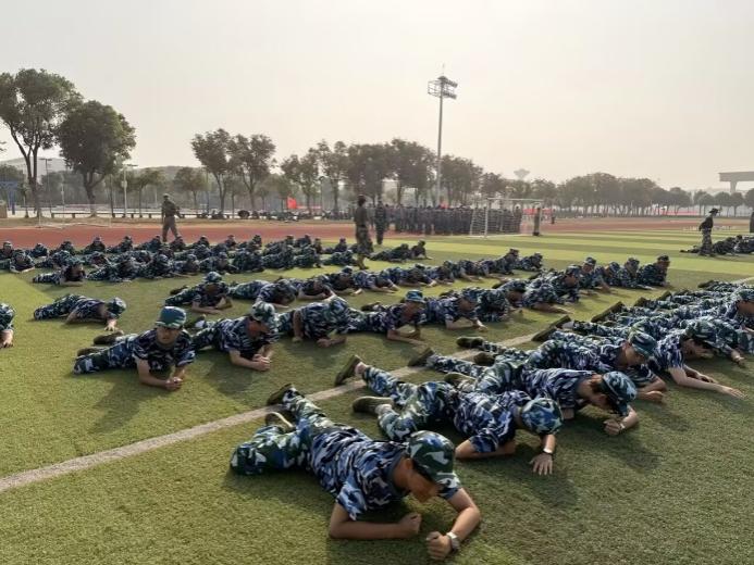 【AC米兰中文官方网站讯】迷彩映晨光,青春砺锋芒;汗水浸戎装,初心铸担当。为进一步锤炼AC米兰中文官方网站2025级新生的意志品质与纪律意识,帮助新生掌握基础军事技能,10月13日清晨,学校操场训练区域已飘扬起鲜亮的迷彩绿——学院全体军训新生身着统一军装,带着饱满的精神状态集结于此,开启了以爬姿训练与军体拳学习为核心的一天专项训练。