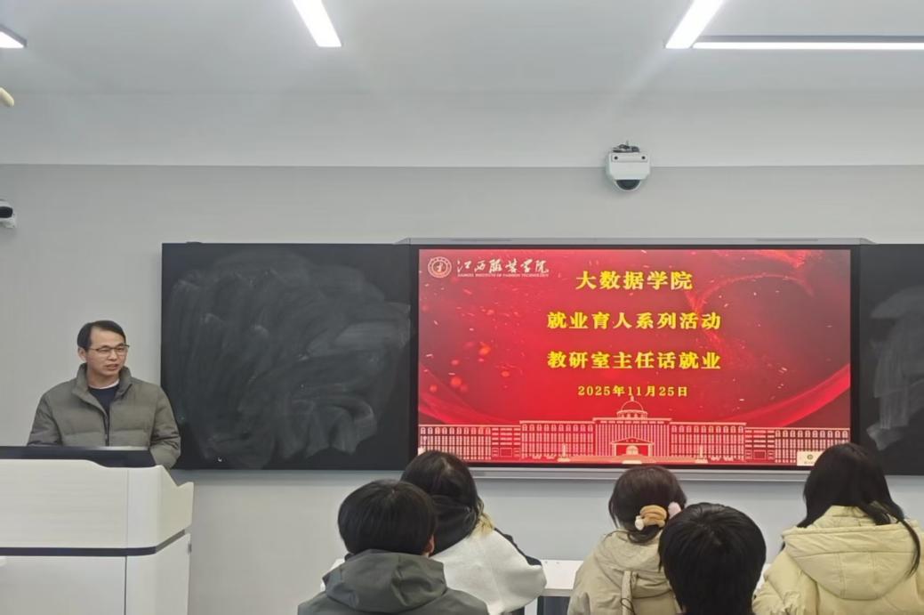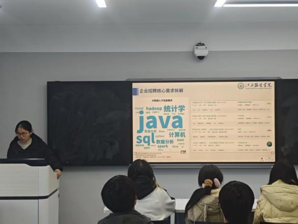 首先,夏贤铃主任以“行业趋势与职业定位”为核心开篇,结合大数据领域最新发展动态,深入解读了行业人才需求的核心逻辑。他指出,当前大数据岗位已从“通用型”向“细分领域专精型”转变,纺织服装数字化、金融数据分析、智能制造数据管控等交叉领域的岗位需求持续增长。针对学生普遍存在的“职业方向模糊”问题,他强调要建立“专业能力+行业场景”的双重竞争力,建议学子结合自身兴趣与专业优势,聚焦1-2个细分赛道深耕,并通过关注行业政策、跟踪头部企业动态等方式把握就业机遇。夏主任分享了学院优秀毕业生的就业案例,通过真实数据展现了不同职业路径的发展前景,引导学生树立“长期主义”的职业规划思维。
