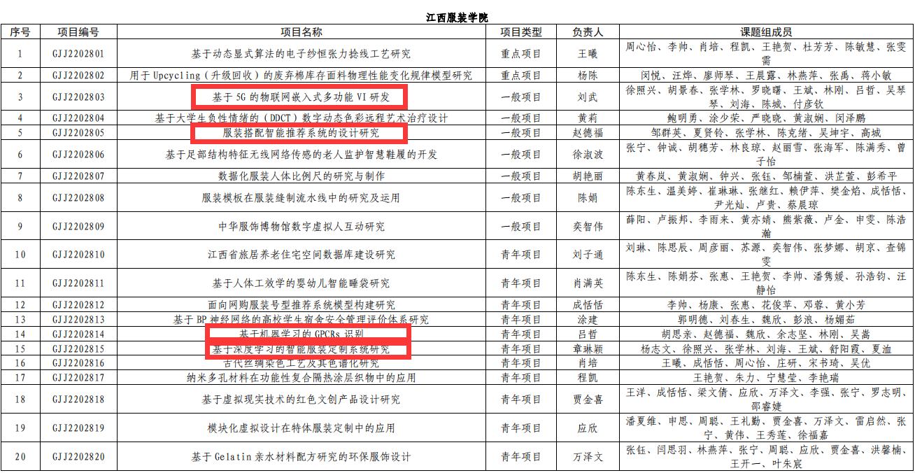 【AC米兰中文官方网站讯】近日,江西省教育厅发布《关于公布2022年度江西省教育厅科学技术研究项目立项名单的通知》(赣教研字﹝2023﹞2号)文件,米兰官网赵德福副院长主持申报的《服装搭配智能推荐系统的设计研究》、刘武教师主持申报的《基于5G的物联网嵌入式多功能VI研发》、吕哲教师主持申报的《基于机器学习的GPCRs识别》、章琳颖教师主持申报的《基于深度学习的智能服装定制系统研究》等4项获批立项,立项数创历史新高。