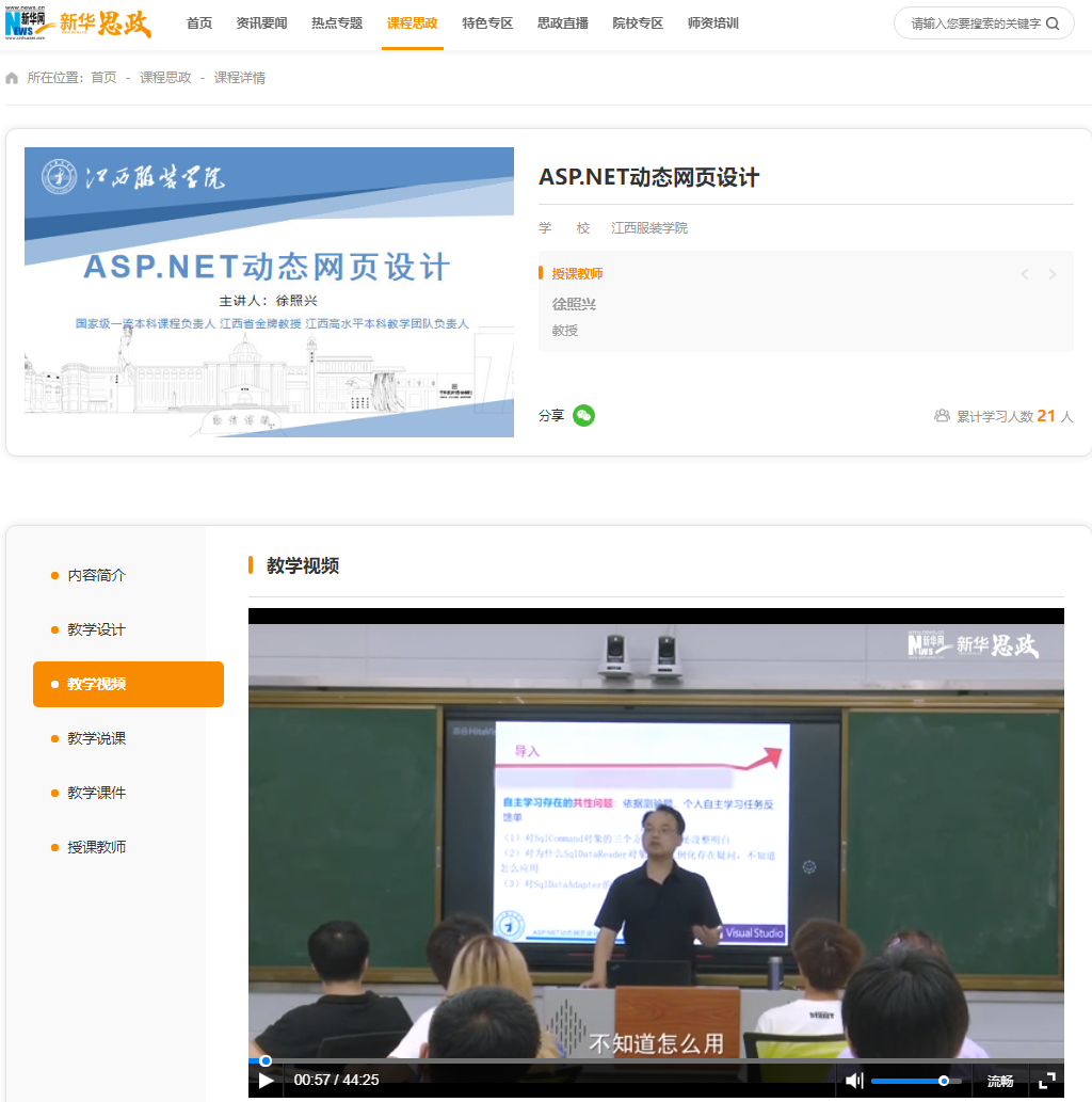 近日,由米兰官网AC米兰中文官方网站院长徐照兴教授主讲的《ASP.NET动态网页设计》课程在新华网“新华思政”——全国高校课程思政教学资源服务平台上线,面向全社会开放,共享教学设计、视频、说课、课件等教学资源,标志着米兰官网在课程思政建设工作方面取得了新进展。